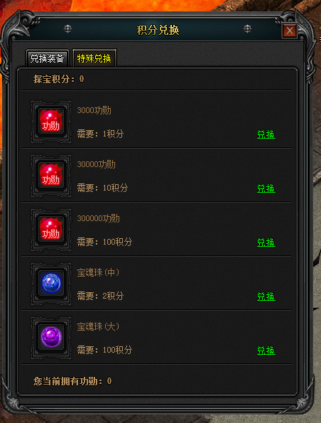 更新后每探宝1次可以获得1点探宝积分,探宝积分可以用来兑换装备和道具,功勋值将不在探宝界面上显示~(可前往土城NPC-押镖囚徒处查看当前功勋值)