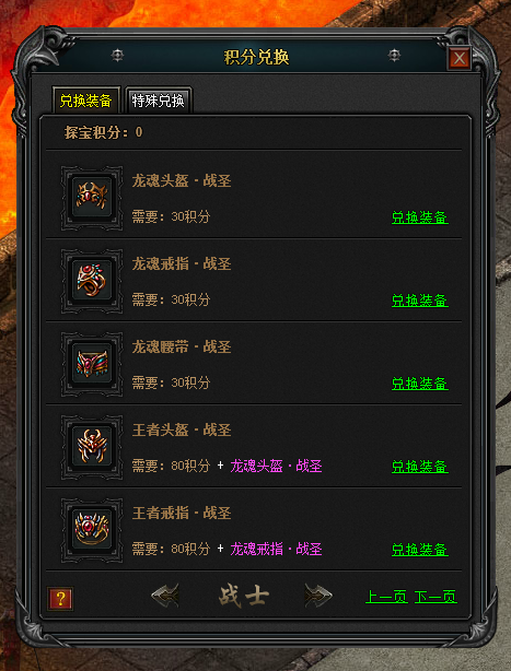 探宝一次可获得1点积分,积分可以兑换龙魂,王者,至尊部分装备,同时还可以兑换主宰装备!