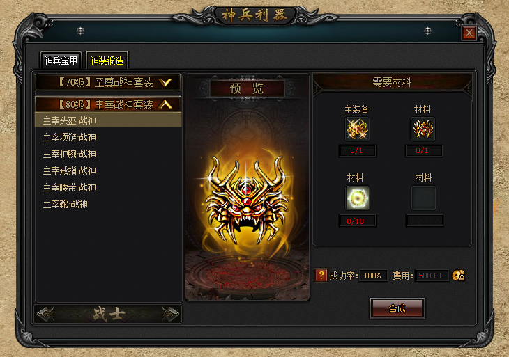 本次推出主宰战神、主宰法神、主宰道神等三套装备,主宰神装可通过至尊神装和应的主宰紫色装备以及少量的星芒魔珠升级获得!