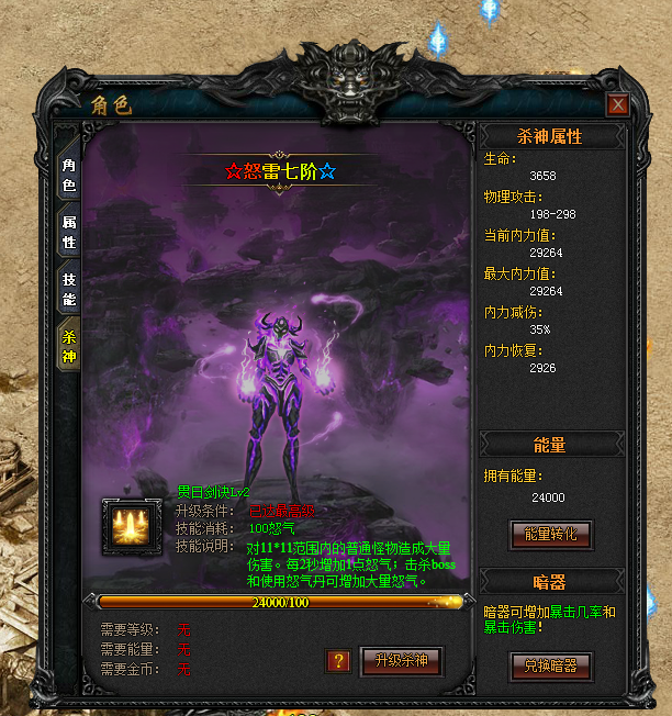 杀神等级越高给角色附加属性越高,能够抵挡的伤害越高,恢复抵挡伤害的能力也就越强大!每一级杀神提升需要经过七个阶段,玩家可将经验转化为能量用于升级杀神。