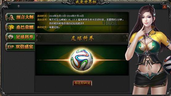 【活动内容】:每天可在比崎城(95,115)NPC福来妹妹处参与足球科举,考验你对足球的了解,答题限时2分钟,在限定答题时间内准确答题越多,奖励越多