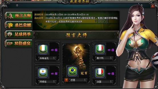 【活动内容】:在2014年6月24号18点前进行世界杯四强和冠军竞猜,竞猜正确可获得神秘丰厚大礼包,奖励会在世界杯后邮件发送