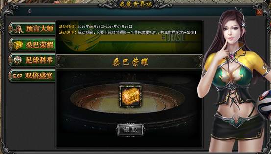 【活动内容】:活动期间,只要上线就可领取一个桑巴荣耀礼包,共享世界杯欢乐盛宴