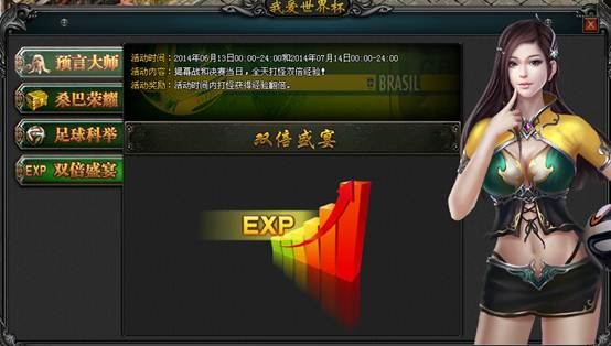 【活动内容】:世界杯期间,揭幕战和决赛当日,全天打怪双倍经验!
