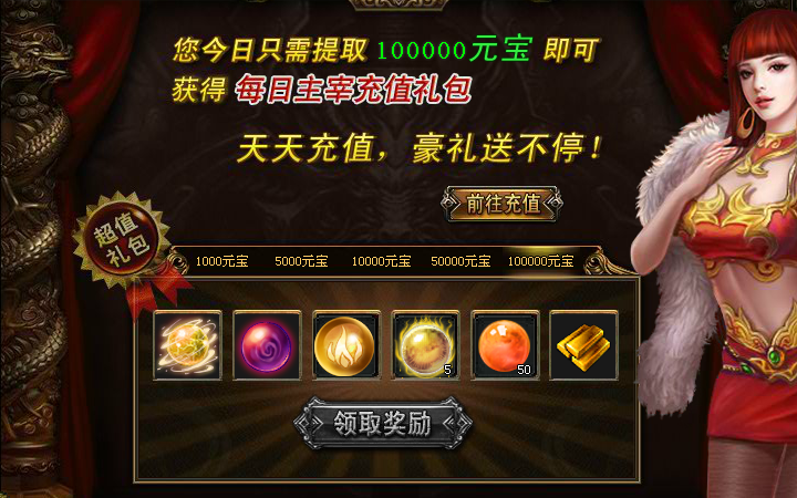 新增每日充值主宰礼包,每日充值10万元宝可以领取,更多福利更超值奖励,更有珍贵的高级能量丹、经验丹(特大)等,超级吸引的有木有!