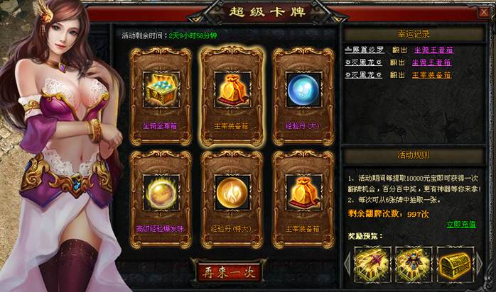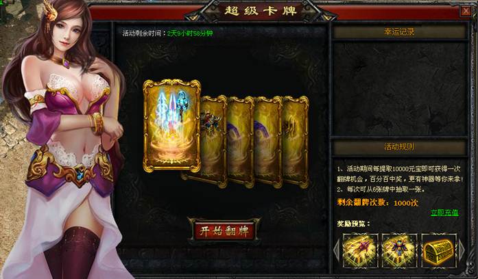 1、活动期间每提取10000元宝(充值提取元宝在活动时间内累计计算)即可获得一次翻牌机会,百分百中奖,更有神器等你来拿!