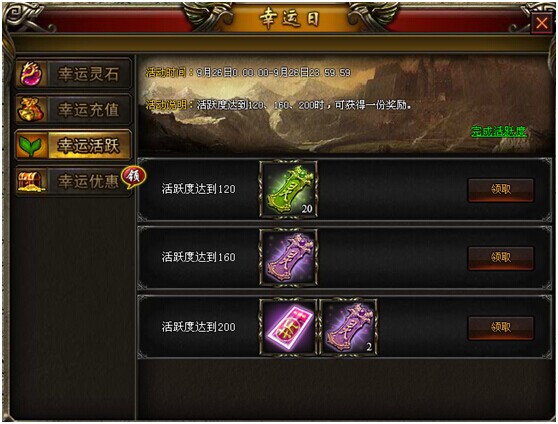 【活动说明】:活跃度达到100、160、200时,可额外领取一份奖励