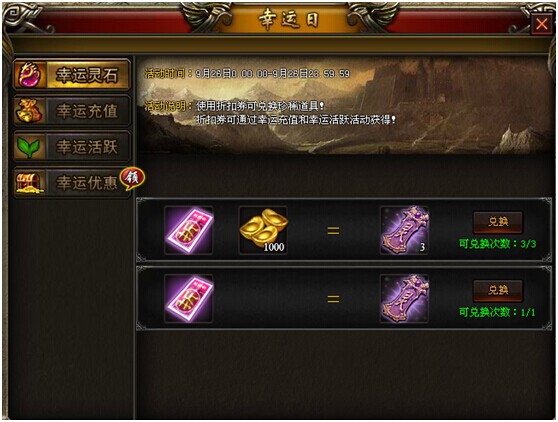 【活动说明】:使用折扣券可兑换珍稀道具,折扣券可通过幸运充值和幸运活跃活动获得~
