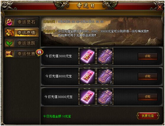 【活动说明】:今日充值达到3000、8000、30000元宝分别可以获得一份珍稀奖励,折扣券可用于兑换极品奖励