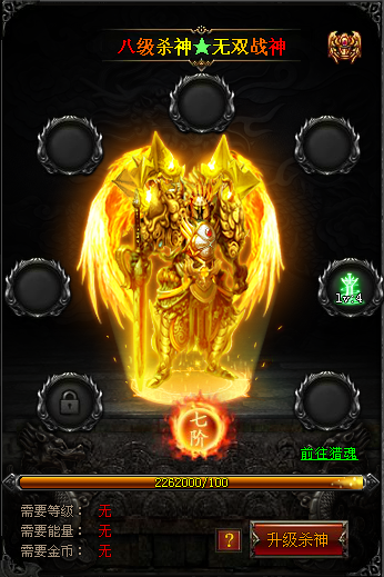 新增加八级杀神等级,可由七级杀神增加能量进行升级!同时升级至八级杀神之后将会开启第六个神魂装备位!