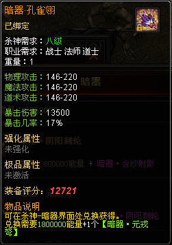 新增高级暗器孔雀翎,高级概率、暴击伤害都有大幅度提高!可通过杀神界面兑换暗器界面兑换获得!