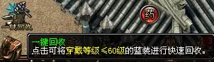 新增一键回收快捷按钮功能,点击可以快速将穿戴等级小于或等于60级的蓝装进行快速回收,减少回收装备操作。