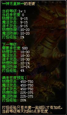 新增亲密度系统,已经结婚的玩家将开启亲密度系统,通过完成日常婚姻任务、击杀boss获得道具可用于提升亲密度,提升亲密度不但可以增加超强属性,更能得到稀有的经验加成属性,还犹豫什么,小伙伴们快来结婚吧!