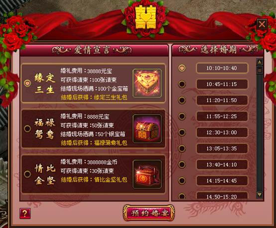 选择缘定三生婚礼,夫妻双方可获得缘定三生礼包,开启可获得稀有时装-绚丽结婚礼服,浓情爱意的七夕即将来临,你还在等什么,快来和亲爱的他一起办个盛大的婚礼吧!