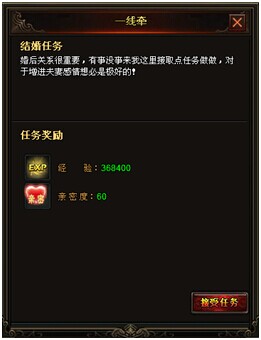 结婚任务:结婚后每天可接受10轮的结婚任务,可获得大量经验和亲密度加成