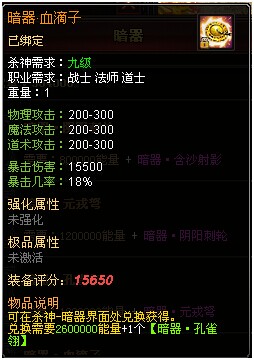 新增高级暗器血滴子,高级概率、暴击伤害都有大幅度提高!可通过杀神界面兑换暗器界面兑换获得!