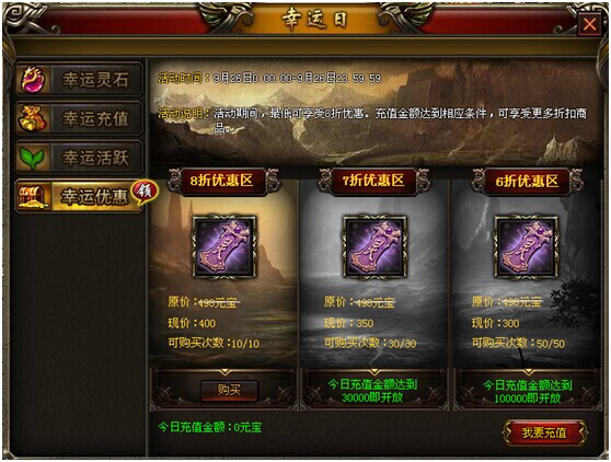 活动说明:活动期间,最低可享受8折优惠,充值金额达到30000元宝,即可开放7折专区,充值金额达到100000元宝满,即可开放6折专区,折扣多多,优惠多多