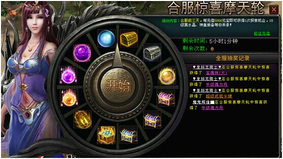 活动内容:合服前三天,每充值5000元宝即可获得1次探索机会, 10级黑水晶、神皇装备等你来拿!