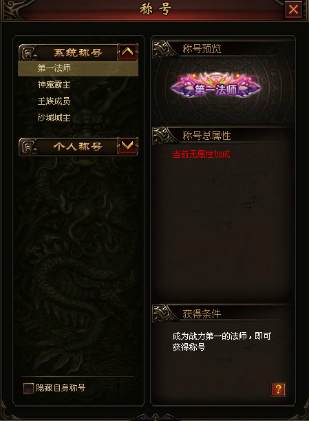 增加称号系统,可以更方便的选择切换称号,特殊称号还将拥有属性加成,通过打开角色面板右下角称号可以进入称号界面进行称号管理。称号属性可以进行叠加