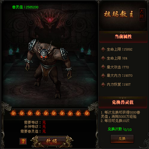新增兽灵系统,通过消耗兽灵进行升级,升级之后可以获得各种怪兽的属性附加,通过消耗经验可以兑换获得兽灵。
