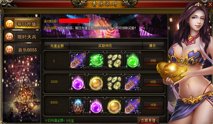 活动说明:活动期间,每日充值(元宝)金额达到相应条件,即可领取奖励。