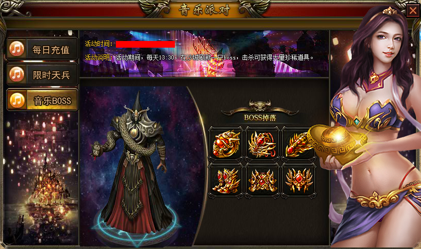 活动说明:活动期间,每天13:30,在沙城刷新一只BOSS,击杀可获得大量珍稀道具。