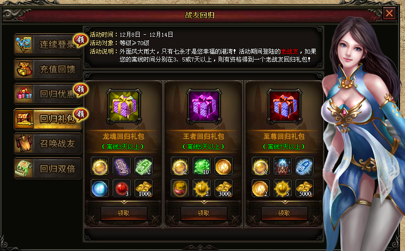 【活动对象】:等级≥70级且5天及以上未登录的老战友