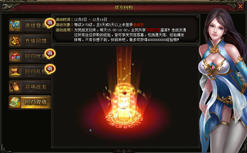 【活动内容】:为贺战友归来,每天15:00~18:00,全民共享双倍打怪盛宴!老战友通过所有途径获取的经验,皆可享受双倍恩惠,包括通天塔、经验爆发珠等,只有你想不到,快回来吧!最多可获得4000000000经验!