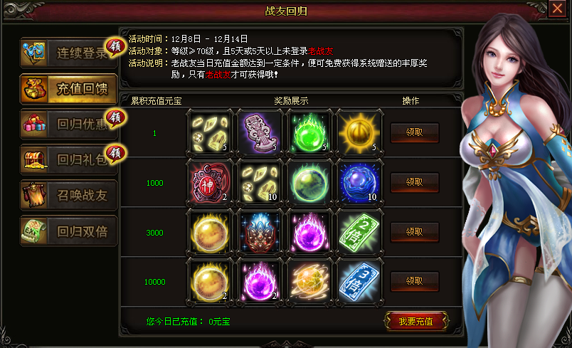 【活动内容】:活动期间,老战友充值金额达到一定条件,即可领取丰厚的奖励!