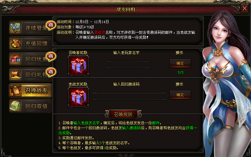 【活动对象】:等级≥70级且5天及5天以上未登录的老战友