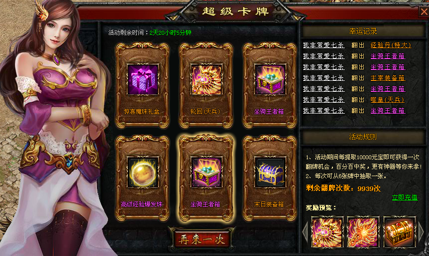 【活动内容】:活动期间,每提取10000元宝,即可获得一次翻牌机会,翻牌百分百中奖,每次翻牌从六张牌中抽取一张,更有几率获得轮回(天兵)、噬皇(天兵)、虹霓礼盒(开启可获得对应性别的虹霓凤羽1件)、黄金圣斗士(开启后可获得对应性别黄金圣斗士时装1件)、末日/主宰装备箱、10级黑水晶的珍稀道具
