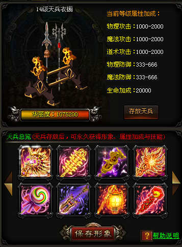 开放14级天兵时装衣橱,通过存放天兵时装可以提升衣橱等级,获得大量属性加成。