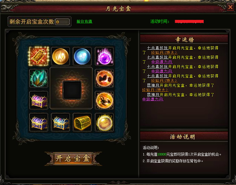 【活动奖励】:活动期间,每充值10000元宝即可获得1次开启宝盒的机会,每次开启百分百获奖,开启宝盒即可从界面展示的道具中随机获得一个,更有几率获得天下无双称号、灵魂战车、狂热天蝎、10级黑水晶、神皇装备箱等极品道具,活动获得的奖励物品直接发放至背包中。