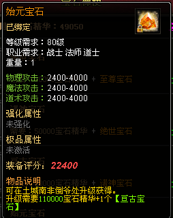 新增14级宝石—始元宝石,升级可获得强大属性,消耗宝石精华可在土城南非倒爷处将亘古宝石升级为始元宝石。