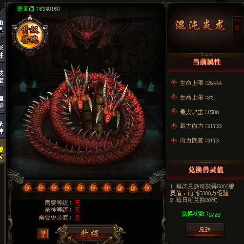 新增高级兽灵-混沌炎龙,通过消耗兽灵值可在角色界面兽灵面板进行升级,升级可获得大量属性加成。