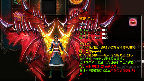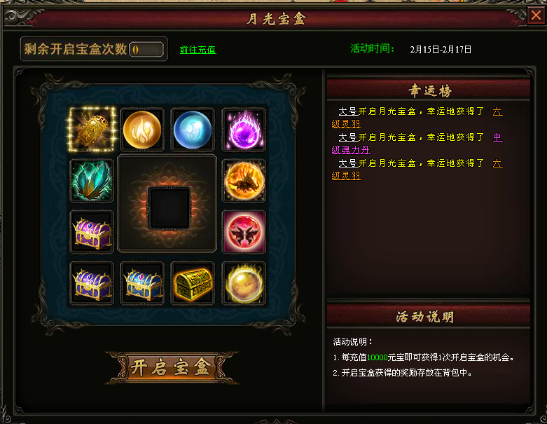 【活动奖励】:活动期间,每充值10000元宝即可获得1次开启宝盒的机会,每次开启百分百获奖,开启宝盒即可从界面展示的道具中随机获得一个,更有几率获得雪域圣灵、魅影传说、独孤求败(称号)、10级黑水晶礼盒等极品道具,活动获得的奖励物品直接发放至背包中。