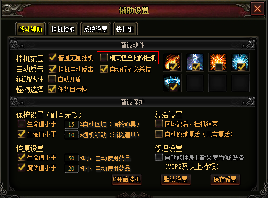 注:勾选精英怪全地图挂机同时将取消普通范围挂机,请注意根据挂机场所进行选择。