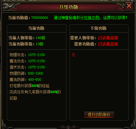 感觉打怪经验加成不够高?那就赶紧来试试13级功勋,打怪额外活动60%的经验,还附带完成任务有几率额外获得60%的经验,最后还有超高属性加成。三者兼备,无可挑剔。