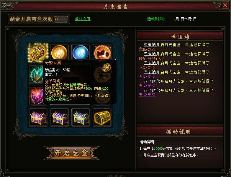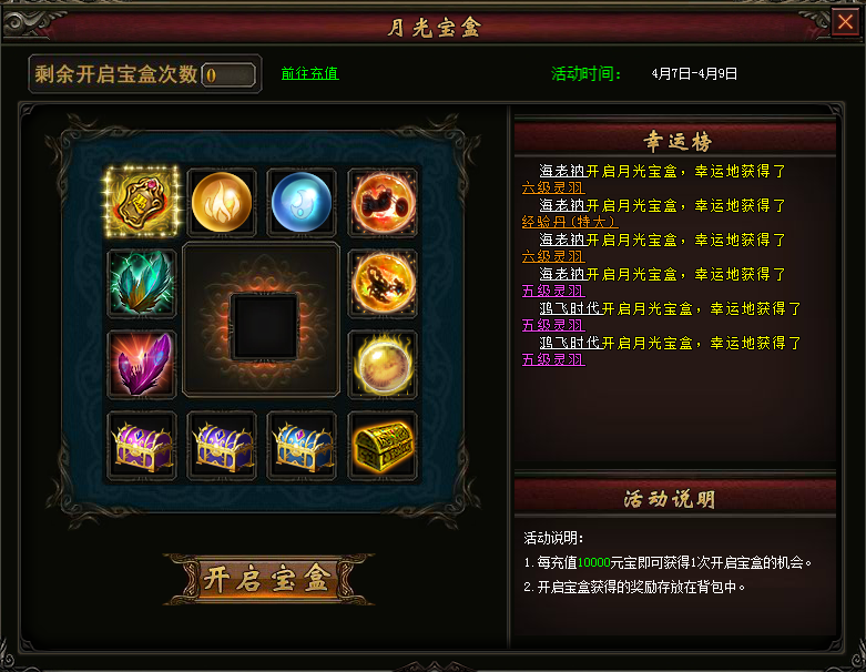 【活动奖励】:活动期间,每充值10000元宝即可获得1次开启宝盒的机会,每次开启百分百获奖,开启宝盒即可从界面展示的道具中随机获得一个,更有几率获得大智若愚、灵魂战车、10级黑水晶等极品道具,活动获得的奖励物品直接发放至背包中。
