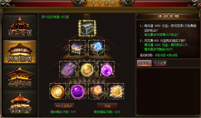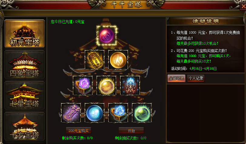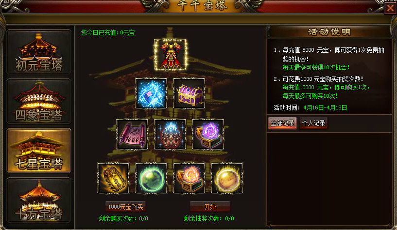 1、每充值1000元宝,即可获得1次免费抽奖的机会!