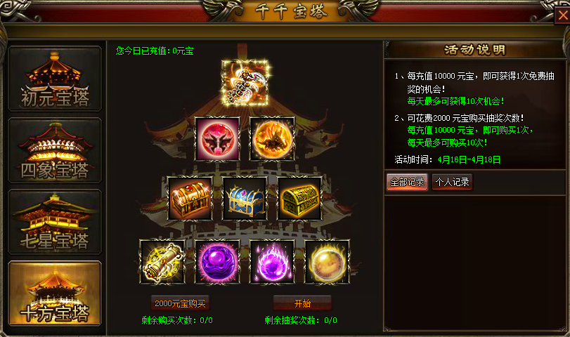 1、每充值10000元宝,即可获得1次免费抽奖的机会!