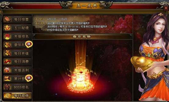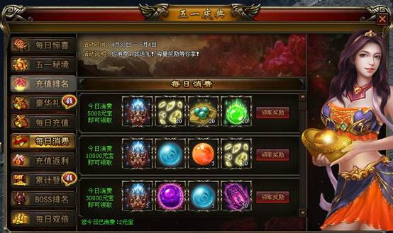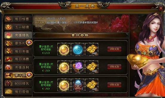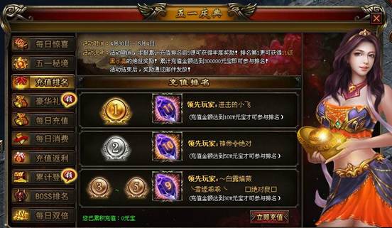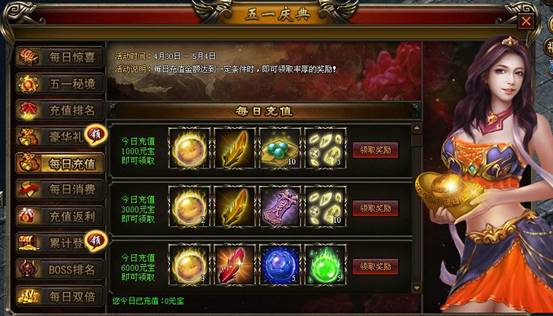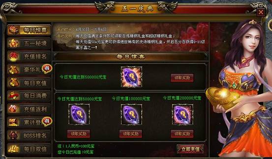 【活动说明】:每日充值达到一定条件,即可领取丰厚的奖励!