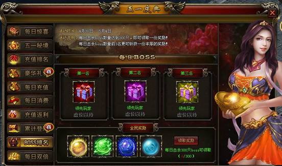 【活动说明】:每日击杀boss数量达到300只,即可领取一份奖励!