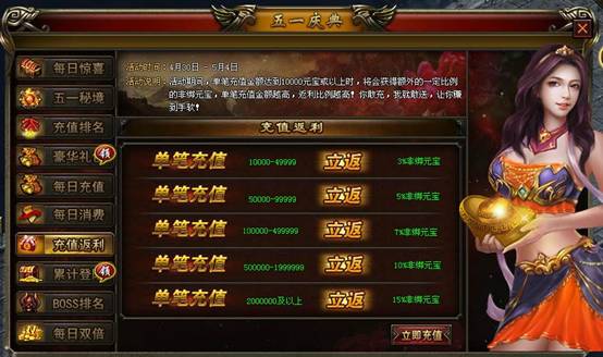 【活动说明】:活动期间,单笔充值金额达到10000元宝或者以上时,将会获得额外的一定比例的非绑元宝,单笔充值金额越高,返利比例越高!你敢冲,我就敢送,让你赚到手软!注:返利元宝与充值同时提取!