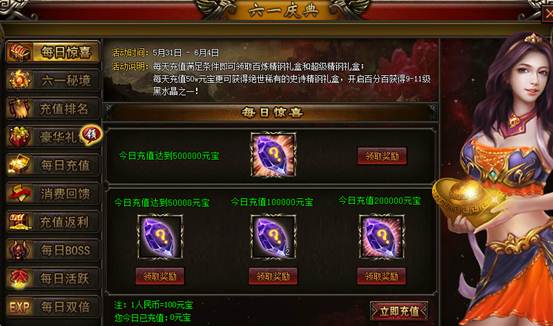 【活动说明】:每天充值满足条件即可领取百炼精钢礼盒和超级精钢礼盒;每天充值50W元宝更可获得绝世稀有的史诗精钢礼盒,开启百分百获得9-11级黑水晶之一