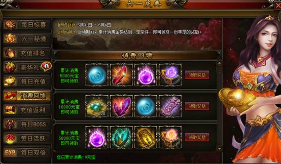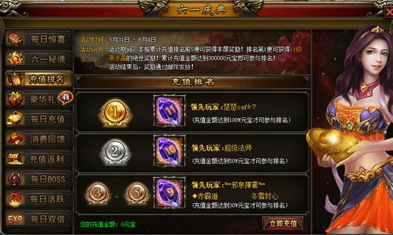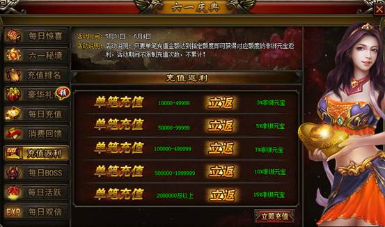 【活动说明】:活动说明,只要单笔充值金额达到指定额度即可获得对应的额度的非绑定元宝返利,活动期间不限制充值次数,不累计!返利元宝与充值元宝同时提取!