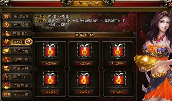 【活动说明】:1元宝买不了吃亏,1元宝也买不了上当!、如下豪华礼包跳楼折扣卖,全部仅需1元宝就可开启第一次,超值惊喜就在指尖斩获!