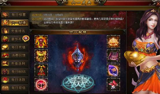 【活动说明】:活动期间,探宝时部分装备和道具的概率翻倍,有几率获得多种珍稀道具,全新给力传说法器来袭!