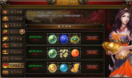 【活动说明】:当活跃度达到50、100、150后,可获得对应的奖励