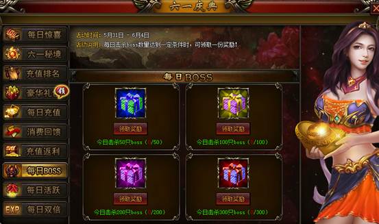 【活动说明】:每日击杀boss数量达到一定条件时,可领取一份奖励!